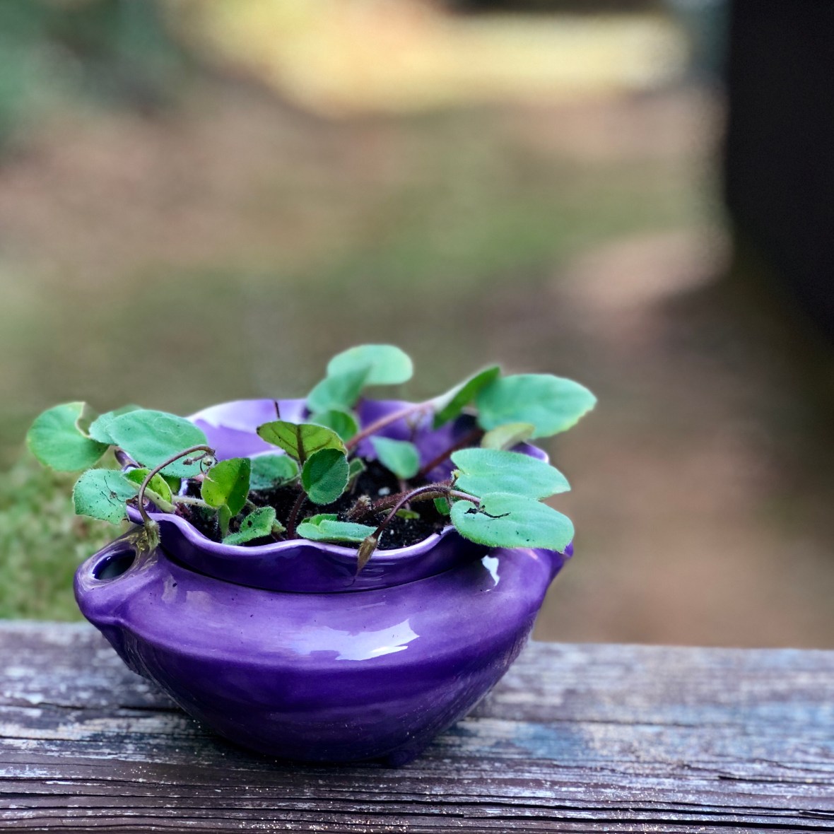 At the time, I had five beautiful, mature AVs that were doing just fine at home, but the sad ghost of my first African violet, whom I slaughtered with ignorance, appeared to me once again as I potted the babies in its former home – a small, purple, self-watering planter. It was the only one I had. (It’s still the only one I have.)