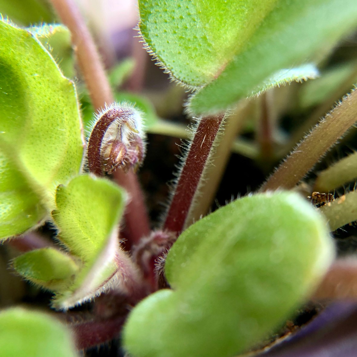 Five days later I had to do a double-take, but yes, the largest plantlet had buds! I was so surprised, I didn’t think baby plants could/would produce flowers since they are still growing. I guess this one was comfy enough, being all snug in a little pot with its siblings, that it decided to throw out these cute little buds. I had to memorialize this discovery with a macro photoshoot, of course (I use the Xenvo clip-on macro lens + my iPhone 8 plus). In light of this, I thought again about separating the little violets: if they’re budding already, they should probably already be separated, but at the same time, I don’t want to risk losing these precious first buds. I stalled for about 5 more days and finally separated + potted them up on April 4. The 2nd and 3rd largest planties were given their own tiny growers pots, the assortment of tiny babies were planted together in a repurposed plastic strawberry container to continue growing, and the biggest baby got the purple pot all to herself (spoiled!). I held my breath for a few days after that because her leaves started to droop, but after about a week she bounced back to her usual perky self. I checked on her (and her siblings) every day for updates, but she was taking her sweet time growing those buds as she stretched her roots around her newfound space. I wonder if she was lonely?